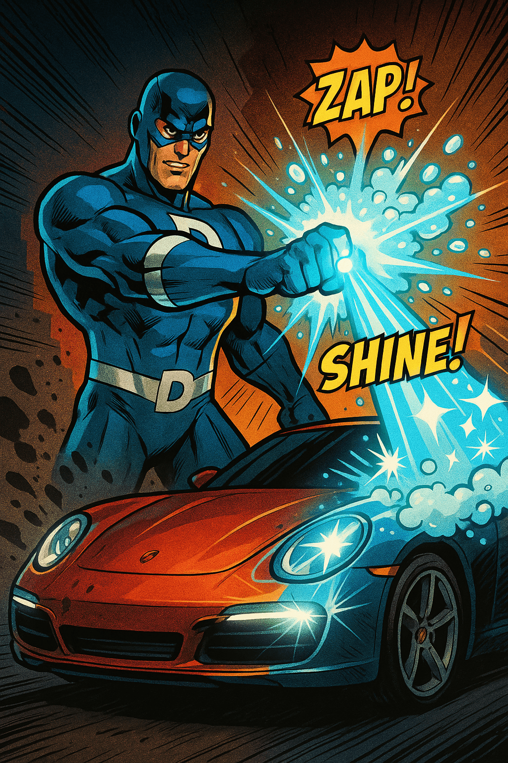 Armed with a glowing ring of pure shine, Dynamo Detail powers up every ride with unstoppable brilliance. From grimy interiors to polished exteriors, he blasts away dirt and brings cars back to life, faster than a speeding buffer, brighter than a fresh wax glow!
